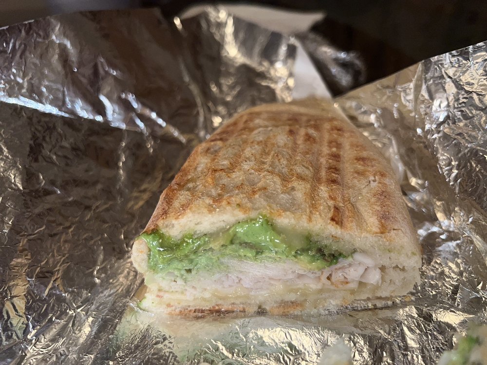 Grilled Chicken Panini with Fontina cheese, Avocado & Sundried Tomato spread.