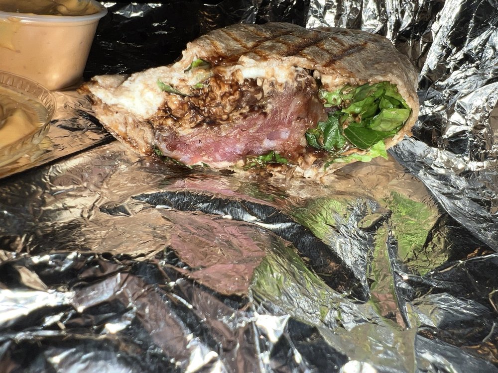 Flank Steak, Yellow cheese, Pepper-jack cheese, Bacon, Red Onion & Chipotle mayo